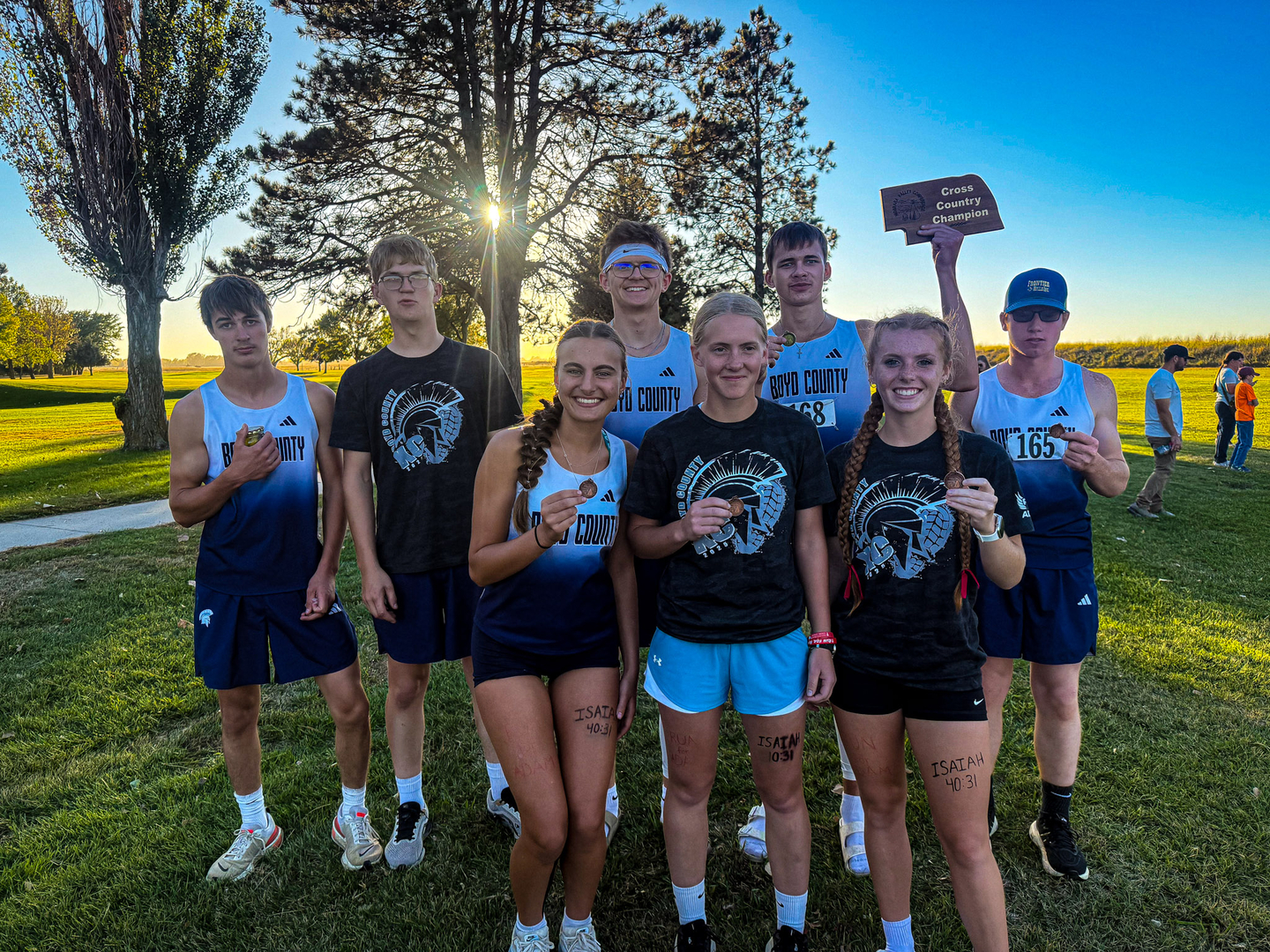 Four championship awards were brought back to Boyd County on Thursday, October 9, 2025 as the Boyd County Cross Country team returned from the Niobrara Valley Conference Meet hosted by Ainsworth. Will Nelson, senior, brought home the boys title with a time of 18 minutes flat. 7th grader Baleigh Koenig took home top honors in the junior high girls 1600m race with her personal best time of 6:37. And 8th grader Case Reiman grabbed the first place medal in the boys junior high 1600m race crushing his personal best with a time of 5:40. The fourth championship of the day was bestowed on the boys team. For the third year in a row the Boyd County Varsity Boys Team won the NVC team title. All those first places are impressive, but check out the rest of the runners. They were impressive too!