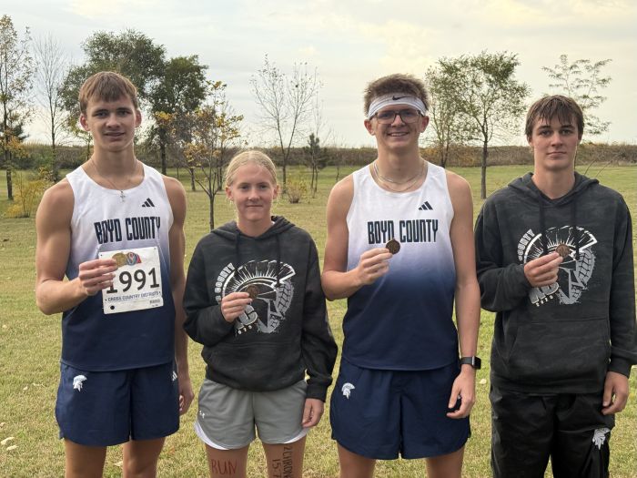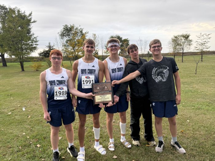 The Boyd County Boys Cross Country Team are repeat district team champions in District D3 cross country after their performance at the district meet on Thursday, October 16, 2025. Will Nelson claimed the individual championship title and three other individual Spartan runners punched their ticket to the state meet. The Spartans drove through wind and rain as they traveled to Ainsworth, but when they arrived the rain stopped, the wind calmed a little, and the Spartans were able to compete on one of the best weather days of the season, and they made good use of it!
