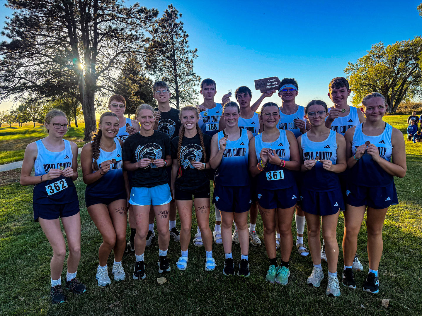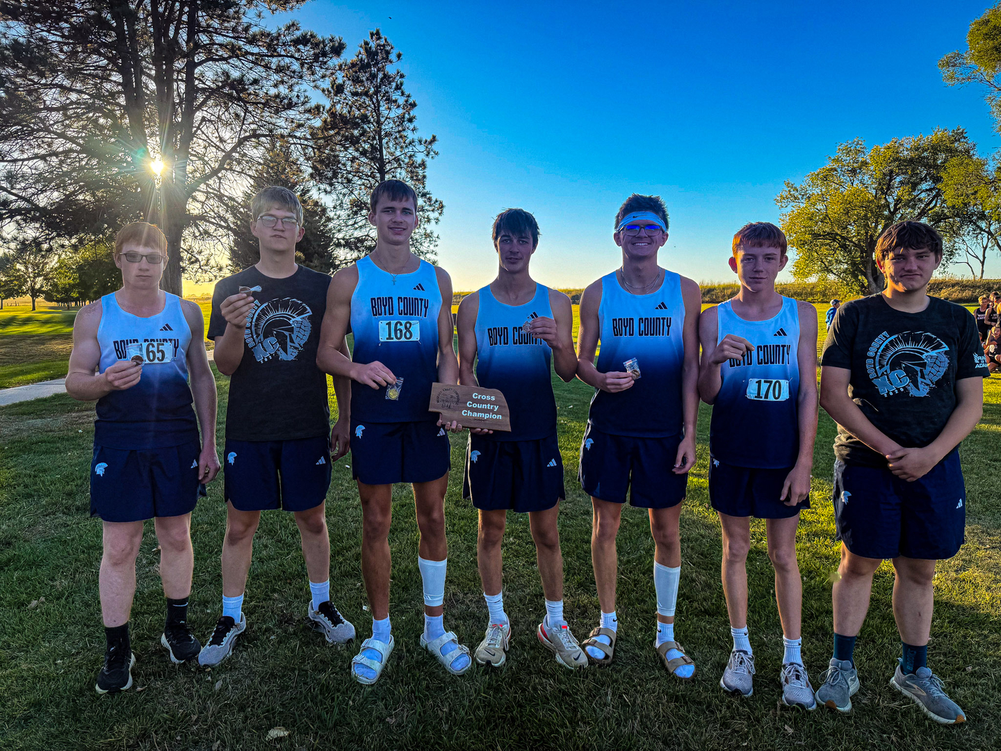 Four championship awards were brought back to Boyd County on Thursday, October 9, 2025 as the Boyd County Cross Country team returned from the Niobrara Valley Conference Meet hosted by Ainsworth. Will Nelson, senior, brought home the boys title with a time of 18 minutes flat. 7th grader Baleigh Koenig took home top honors in the junior high girls 1600m race with her personal best time of 6:37. And 8th grader Case Reiman grabbed the first place medal in the boys junior high 1600m race crushing his personal best with a time of 5:40. The fourth championship of the day was bestowed on the boys team. For the third year in a row the Boyd County Varsity Boys Team won the NVC team title. All those first places are impressive, but check out the rest of the runners. They were impressive too!
