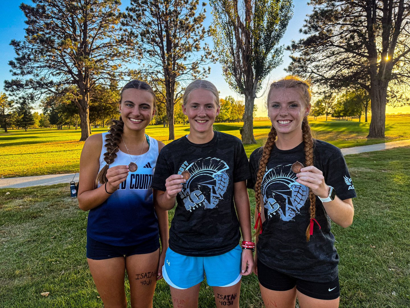 Following B Koenig’s example of winning a medal in the girl’s junior high race, the other four Spartan Ladies, all 8th graders, grabbed medals of their own. Savannah Zeisler placed 6th with a personal record time of 7:43. Trina Bennet also had a personal record placing 7th with an 8:06 time. Corinna Reiser had a personal record time of 8:25 earning herself the 9th place medal. And Brynlee Janousek grabbed the 10th place medal with a time of 8:28.